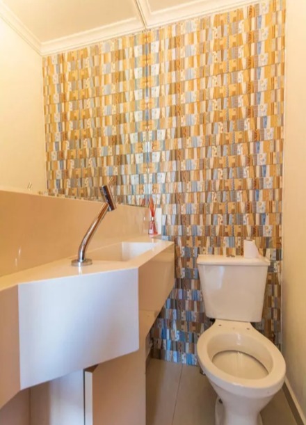 Lavabo e varanda aberta integrada com cozinha e sala, num conceito arquitetônico moderno, totalmente mobiliado.